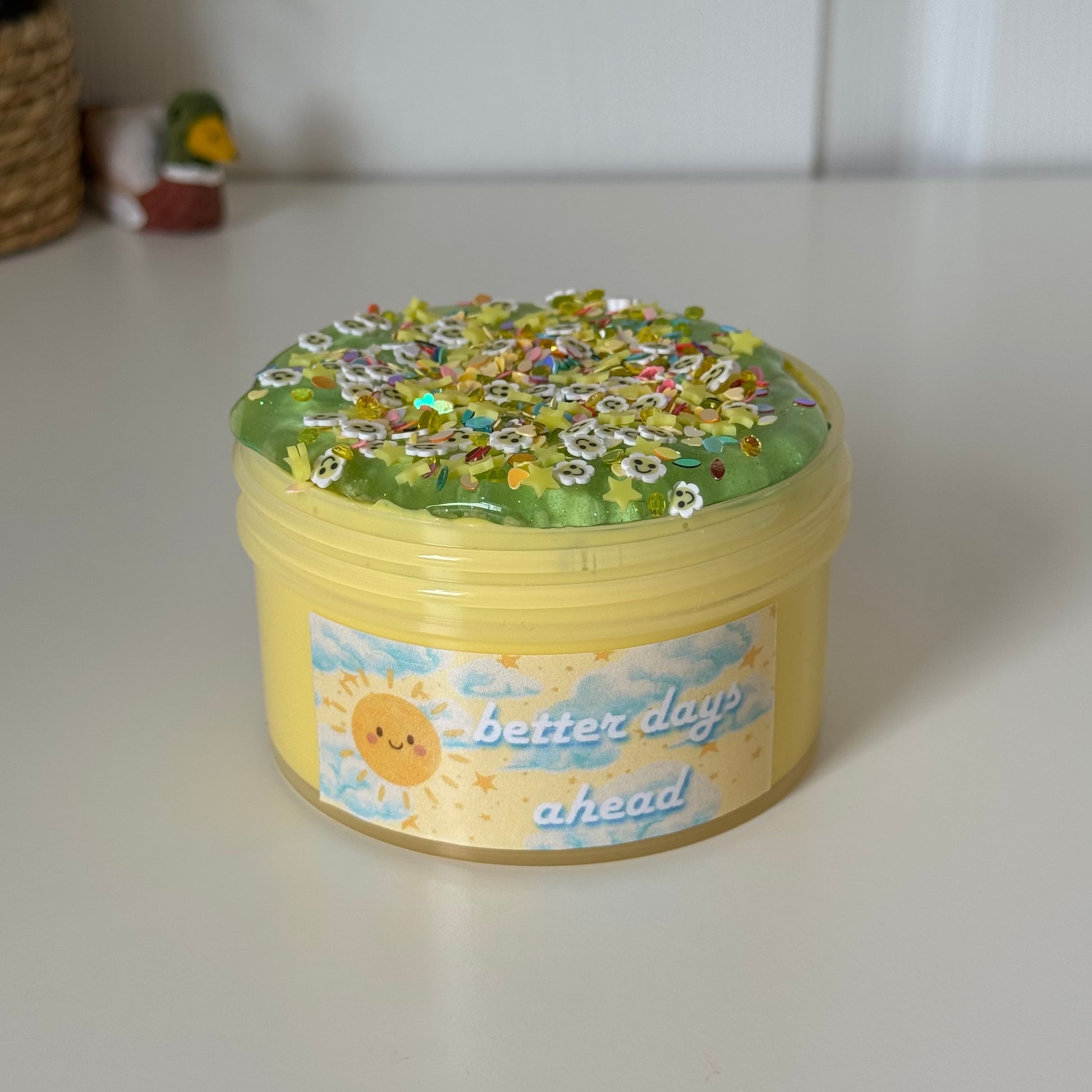 Slimes may look slightly different in person because colors might be a little off in photos, colors may mix, or add ins may also sink to the bottom.